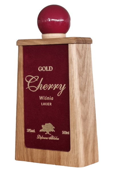 Likier Gold Cherry to wyjątkowy trunek zamknięty w butelce, która jest całkowicie otoczona elegancką dębową karafką. Przód i tył tej karafki wykończone są flokiem w głębokim, rubinowym kolorze, co nadaje całości luksusowy wygląd. Delikatnie zdobiona powierzchnia dębu podkreśla szlachetność likieru, który skrywa w sobie intensywne nuty dojrzałych wiśni. Całość zamknięta jest lakierowaną nakrętką. To idealne połączenie tradycji i elegancji sprawia, że każda degustacja staje się wyjątkowym doświadczeniem. Likier Cherry w tej unikalnej oprawie to doskonały wybór na prezent lub do wzbogacenia własnej kolekcji.