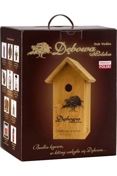 Butelka umieszczona jest w solidnej budce z litego drewna dębowego, w której znajdują się 4 gustowne kieliszki. Co więcej, budka posiada zaczep z tyłu, dzięki czemu można ją powiesić na tarasie lub drzewie. W tej wersji budki mieści się butelka 1,0 lub 0,7. Alkohol zamknięty jest w klasycznej butelce o beczułkowatym kształcie i z charakterystycznym, grubym dnem. Jest to wyróżnik produktów Dębowa Polska. Dodatkowo całość zapakowana jest w estetyczne etui z solidnej tektury, dzięki czemu od razu nadaje się do wręczenia jako prezent.